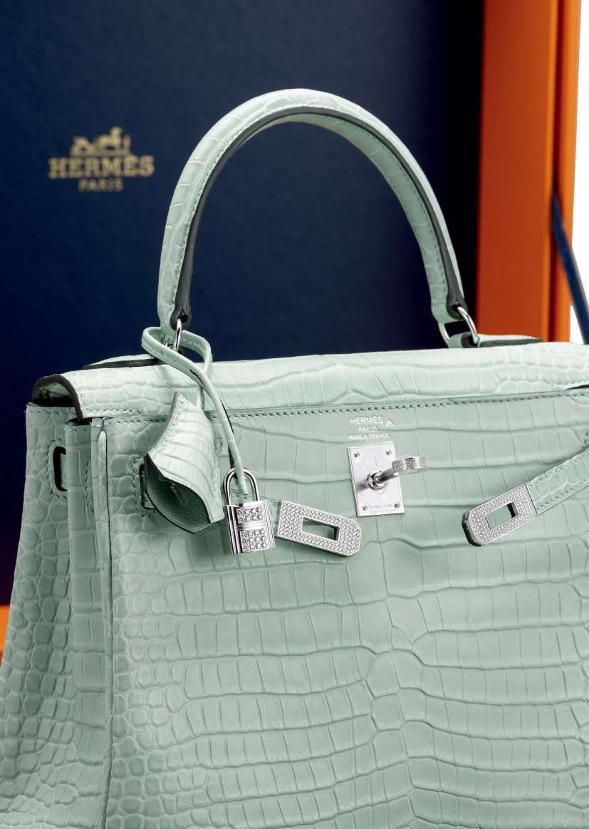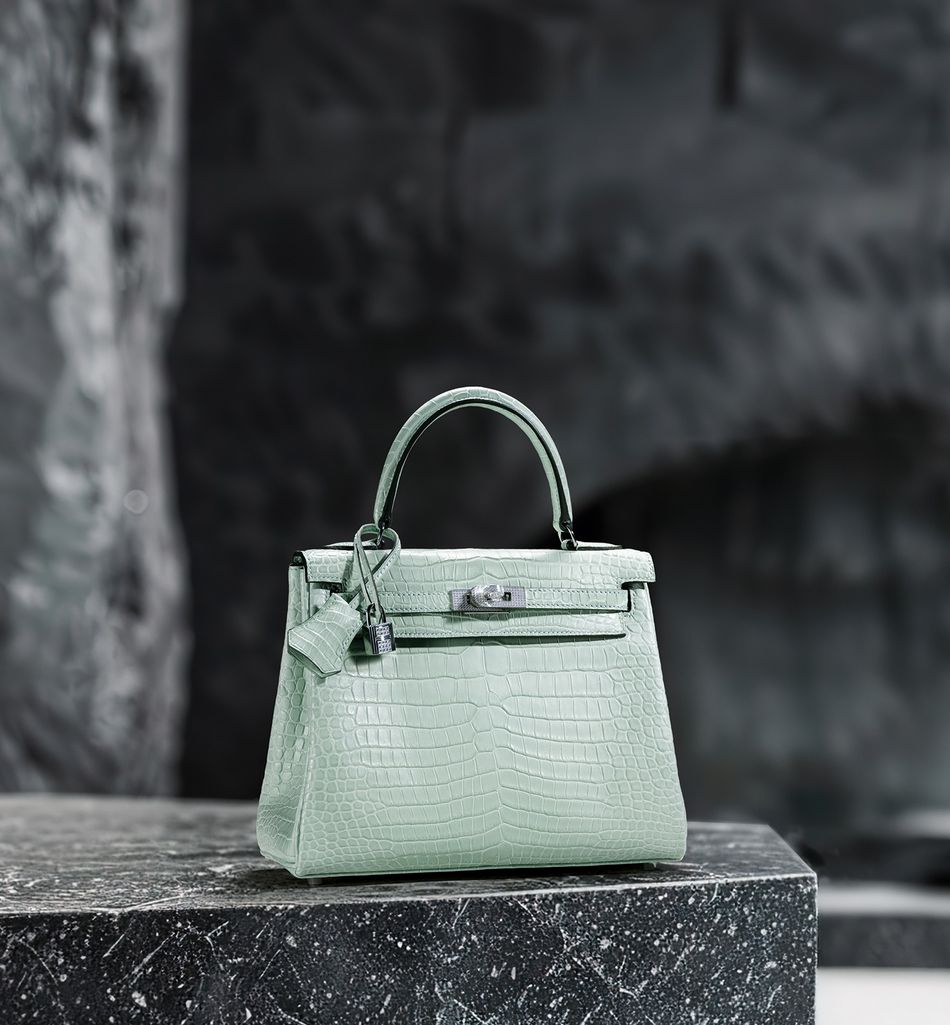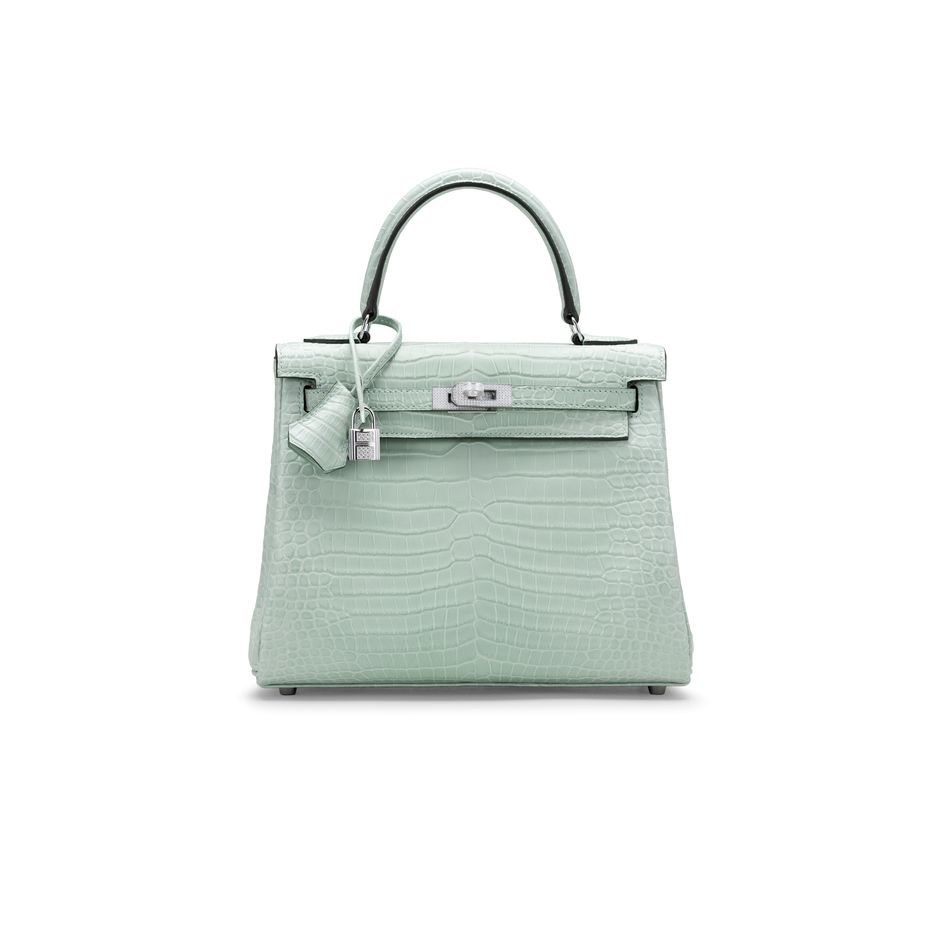 AN EXCEPTIONAL, MATTE VERT D'EAU POROSUS CROCODILE DIAMOND RETOURNÉ KELLY 25 WITH 18K WHITE GOLD & DIAMOND HARDWARE (Features 298 diamonds totaling a carat weight of 3.47 carats set in 92.45 g of 18K white gold hardware.)