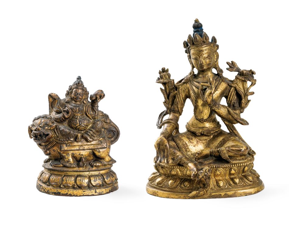 清 銅鎏金財寶天王騎獅像及清晚期 銅鎏金綠度母坐像(兩尊一組)