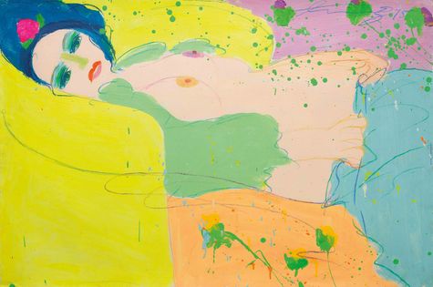 此幅《愛我愛我》是丁雄泉1973年在完成的作品,70年代開始的丁氏浪漫鮮豔風格,以女體為創作主題,花草為輔,既寫花的瑰麗曼妙,亦寫女子的柔媚嬌態,結合鮮艷的用色和大膽的表現方式,展現繽紛燦爛而充滿魔力的愉悅世界,歌頌生命的美好與感官的豐美。畫面中,美人斜臥,肌膚雪白,慵懶倘佯在絢爛的黃綠花草之中,風姿綽約、艷麗華美。有如凌駕於現實之外,既夢幻、亮麗又甜蜜迷人。筆觸中可見藝術家流露其內心的狂野熱情和創作能量,以俐落的線條勾勒人物,背景則使用充滿力道的顏料潑灑、滴流等抽象表現主義的手法,融合高彩度的色塊塗抹。丁氏繪畫造型赤裸而真誠、技法熟練而天真,以獨特的藝術語彙,重新詮釋承襲自堤香、馬奈、莫迪里亞尼、馬諦斯等大師的斜臥裸女畫作,再創當代經典。