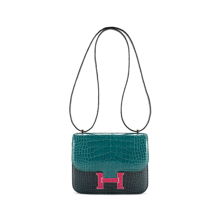 A LIMITED EDITION SHINY VERT ROUSSEAU, VERT BOSPHORE AND ROSE POURPRE ALLIGATOR MINI CONSTANCE 18 WITH PALLADIUM HARDWARE